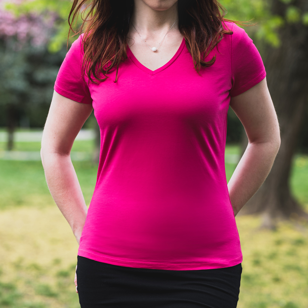 Premiové dámské tričko s výstřihem do V s hladkým lemováním. Krční lemovka je v kontrastní barvě - šedá u barevných triček a bílá u bílých triček, tričko má dvojité švy. Materiál: 100% česaná bavlna, enzymaticky prané, single jersey, oxford grey: 90% bavlna, 10% viskóza.